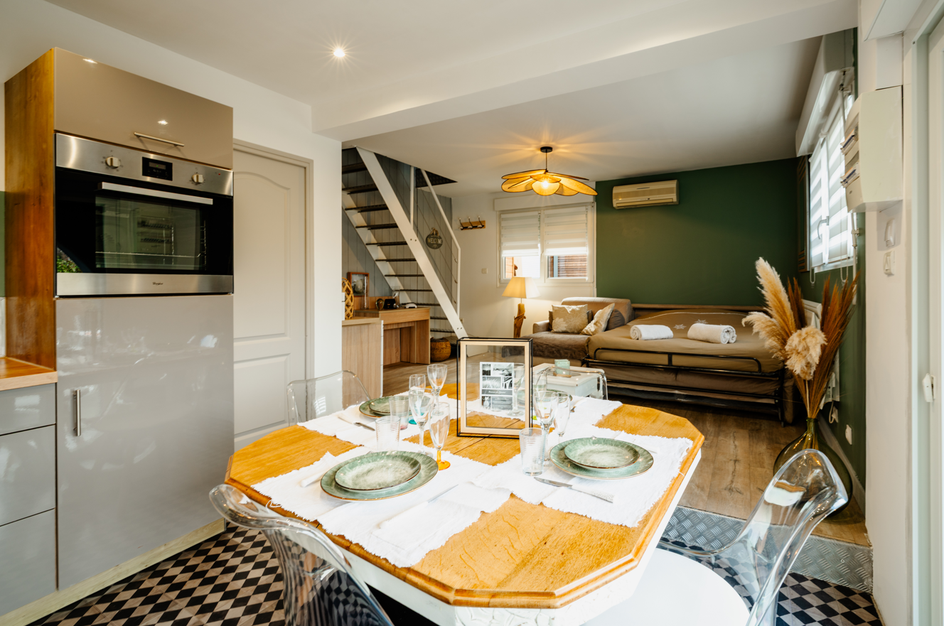- Cuisine équipée (plaque induction, micro-ondes combiné grille, bouilloire