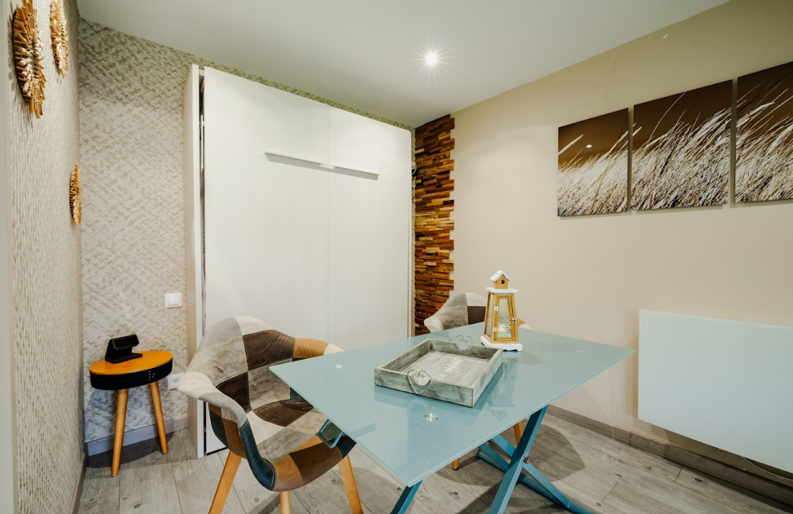 Ici, CONFORT, PRATICITÉ et SÉRÉNITÉ ! Son lit escamotable permet d’optimiser l’espace en journée afin de profiter pleinement du coin salon équipe du WIFI.