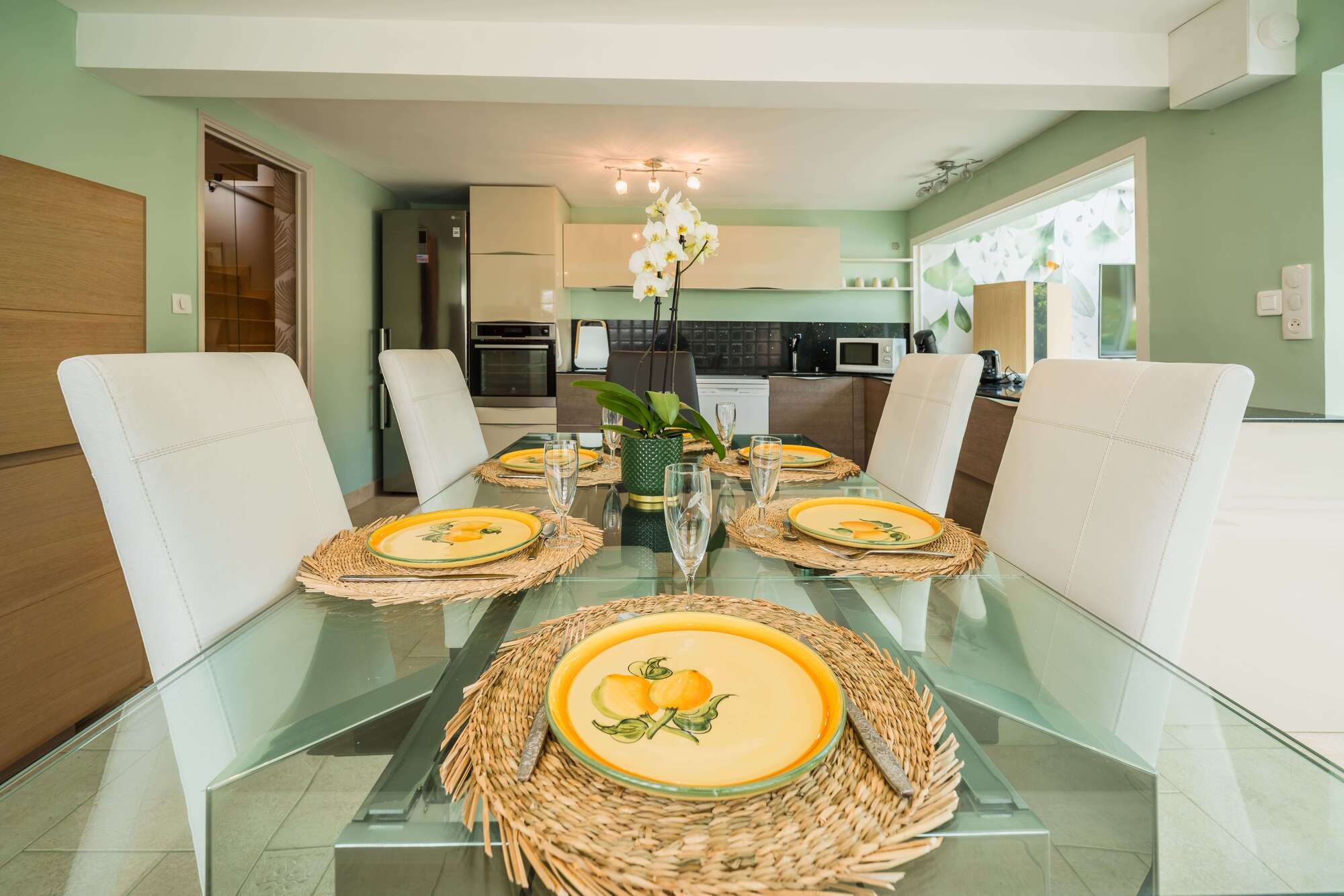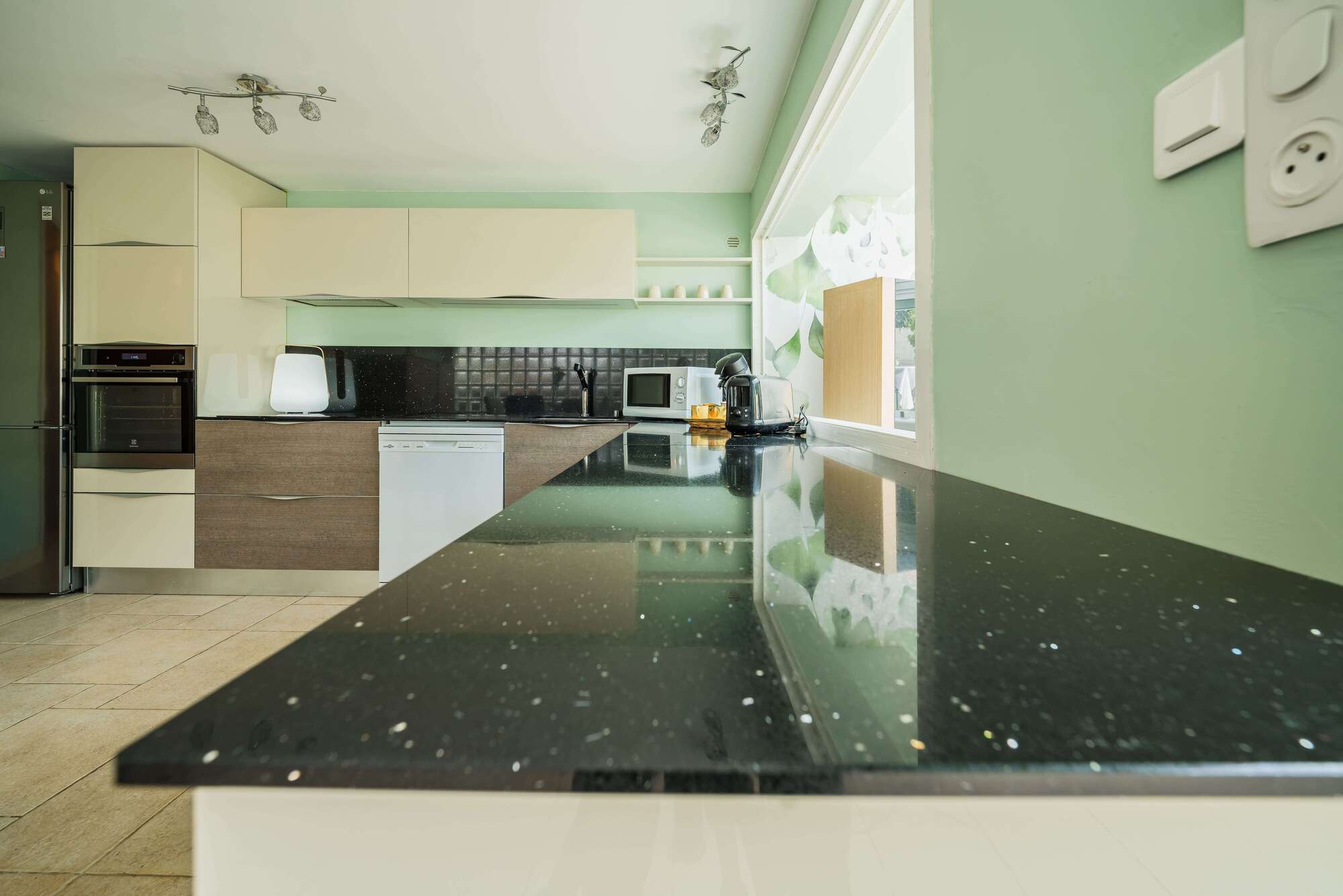 Cuisine entièrement équipée : lave-vaisselle, four, micro-ondes et réfrigérateur.